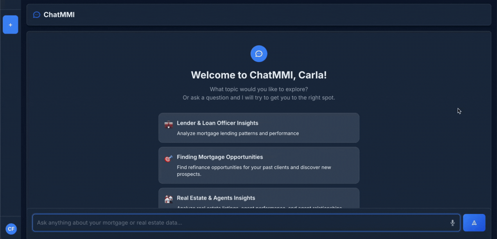 Instead of digging through dashboards or exporting data, users can simply ask ChatMMI questions in natural language—about loan officers, branches, agents, or market performance—and get immediate, verified insights pulled directly from MMI’s datasets. It is a faster, smarter way to work that transforms data into clarity and confidence.